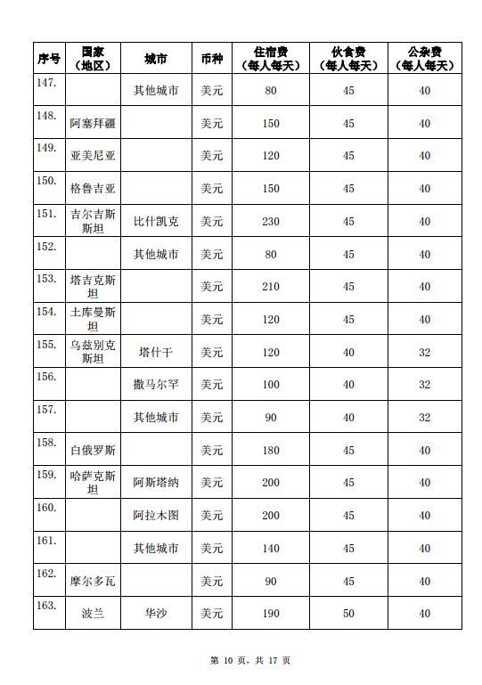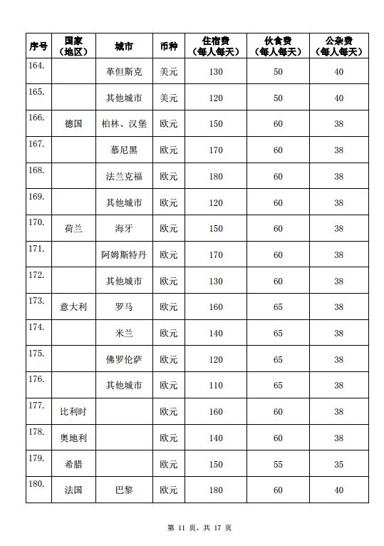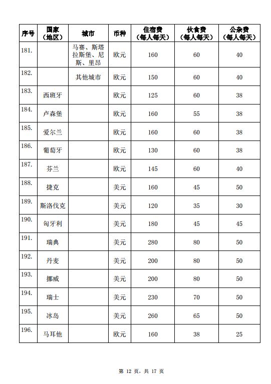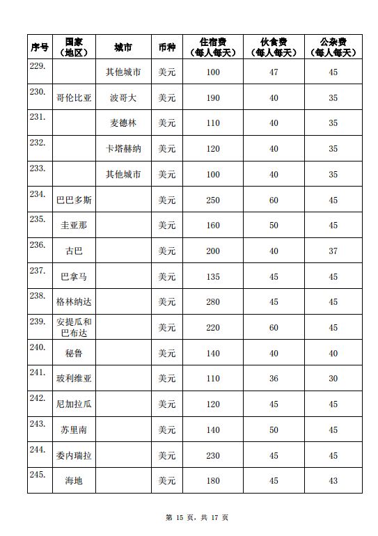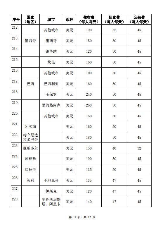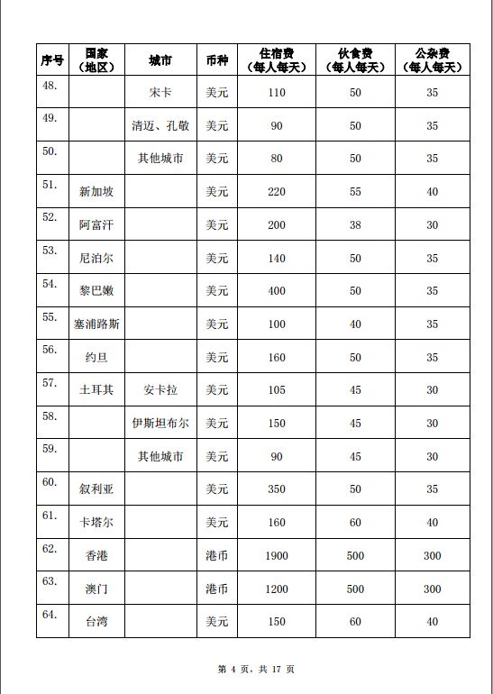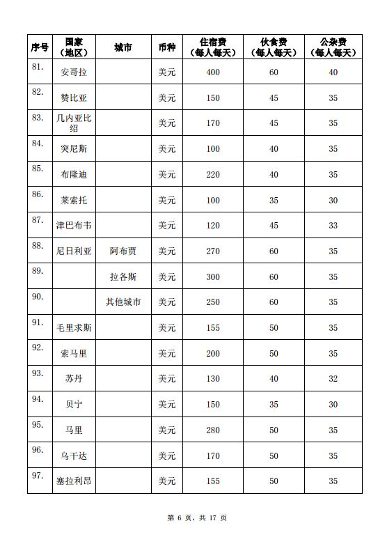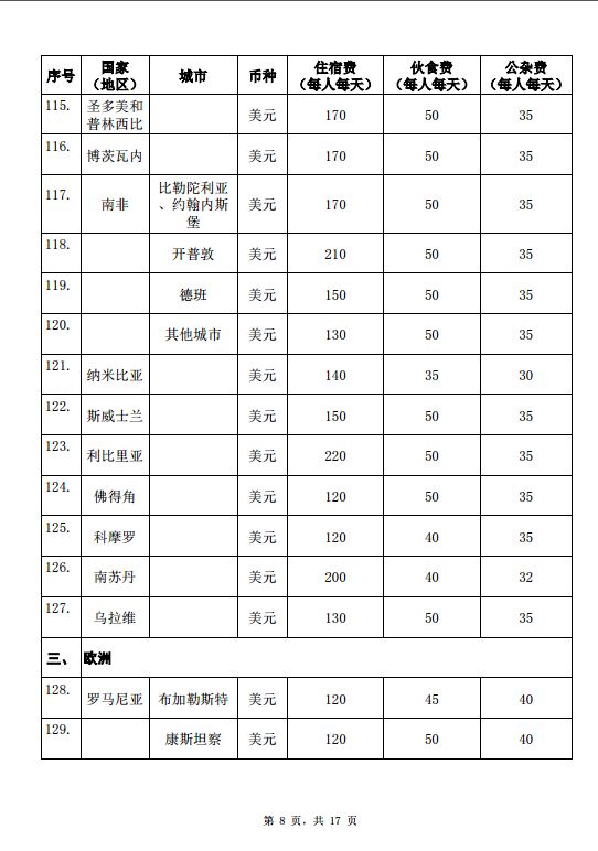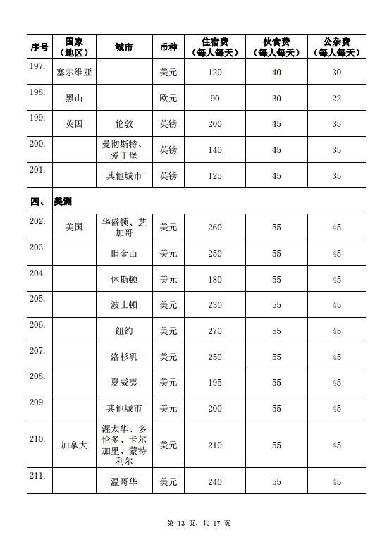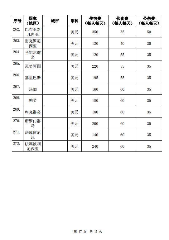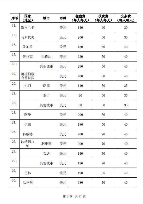 2018年最新各國和地區(qū)住宿費、伙食費、公雜費開支標(biāo)準(zhǔn)表