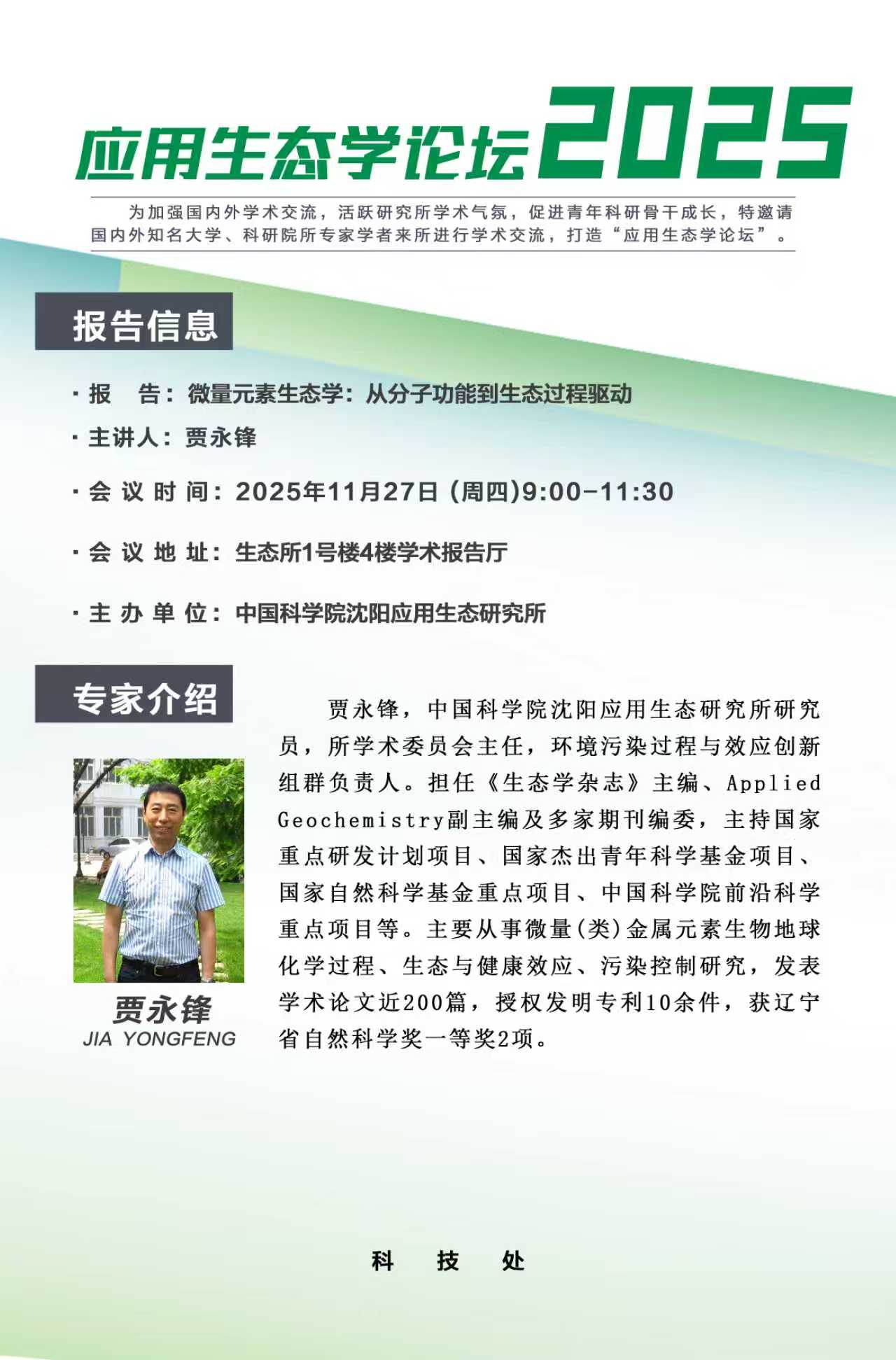 ??? 為進一步加強國內(nèi)外學術(shù)交流,擴展科研人員知識面,促進青年科研骨干成長,提高研究所人員整體科學研究水平,2025年 “應用生態(tài)學論壇”系列活動全新升級。歡迎廣大科研工作人員及研究生積極參與!
